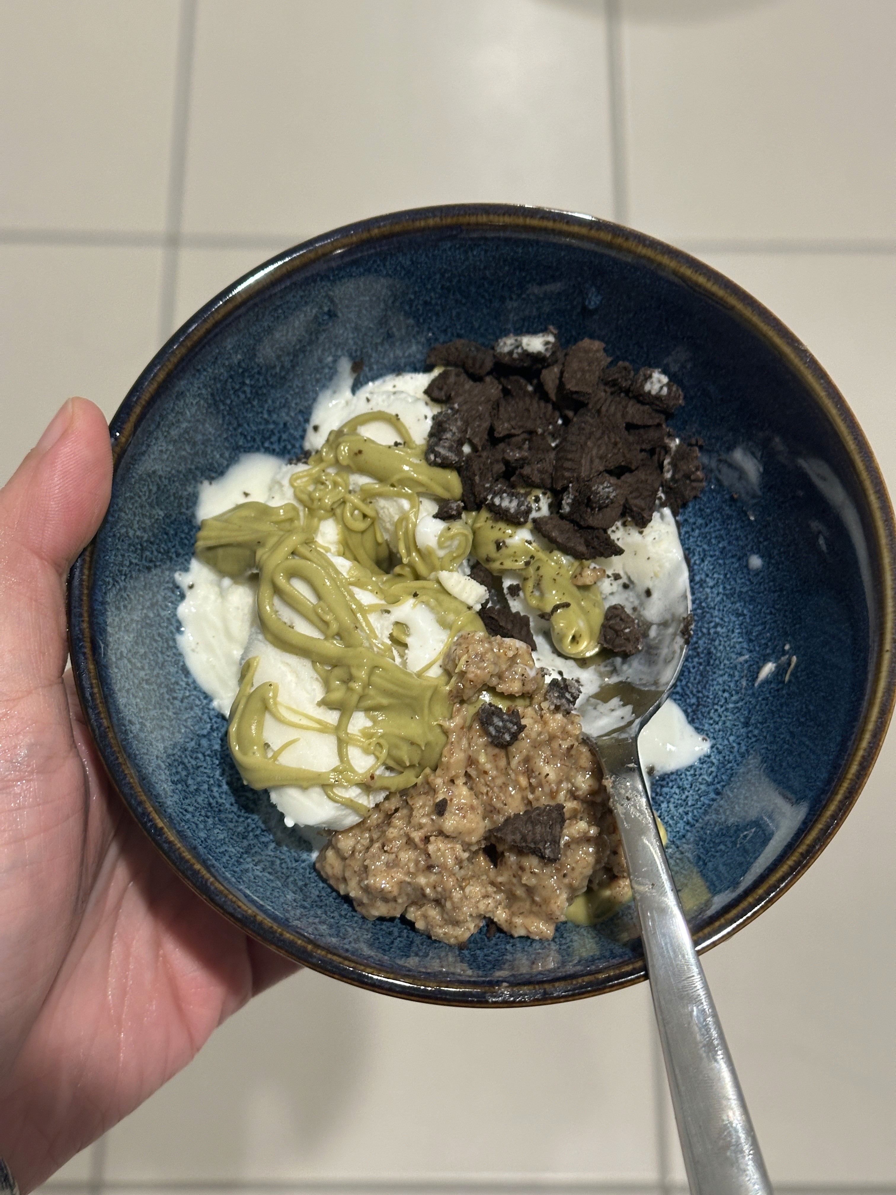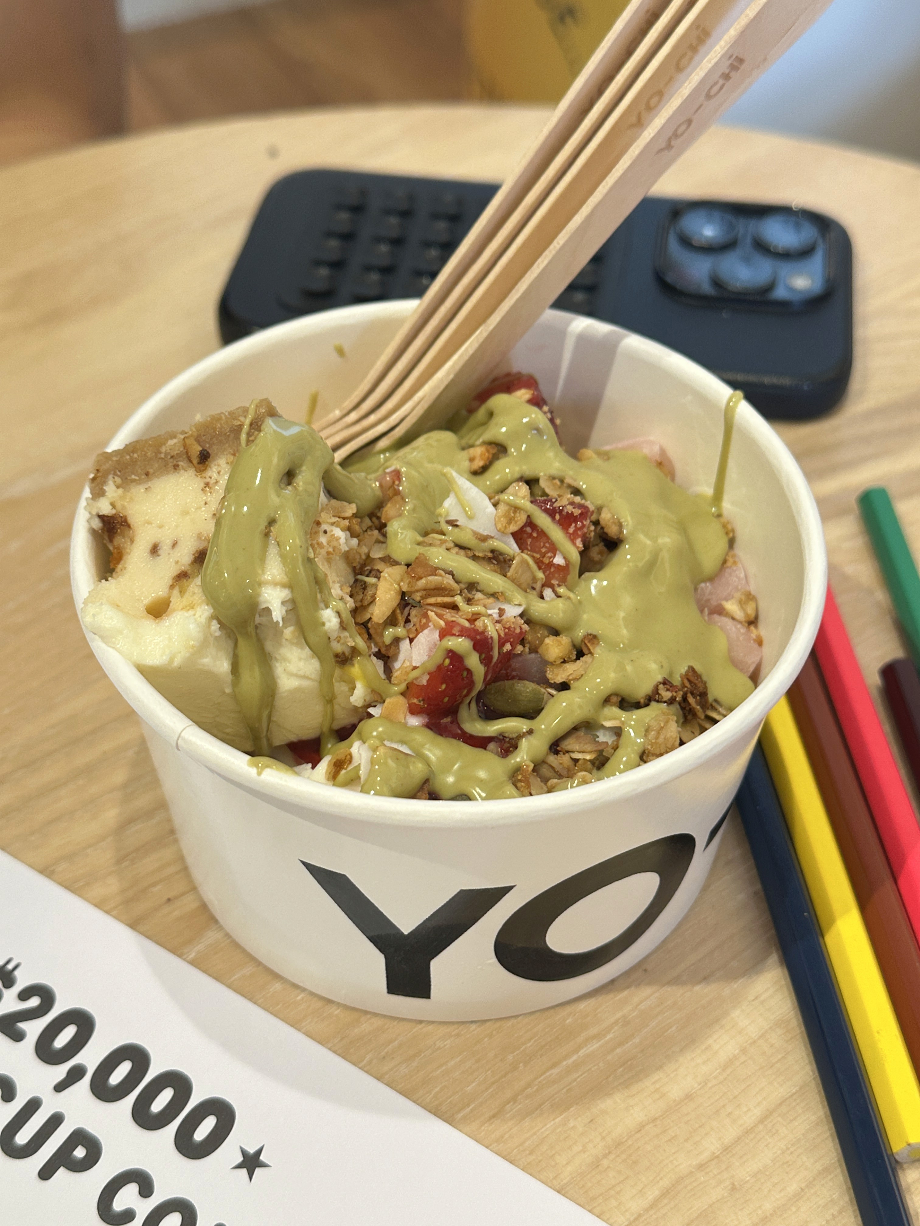 But we bought pints of the plain original Yo-Chi from the supermarket and ate them on some nights at my sis house, honestly liked that more. I just paired it with oreos and pistachio sauce and it was great. Less is more, indeed…