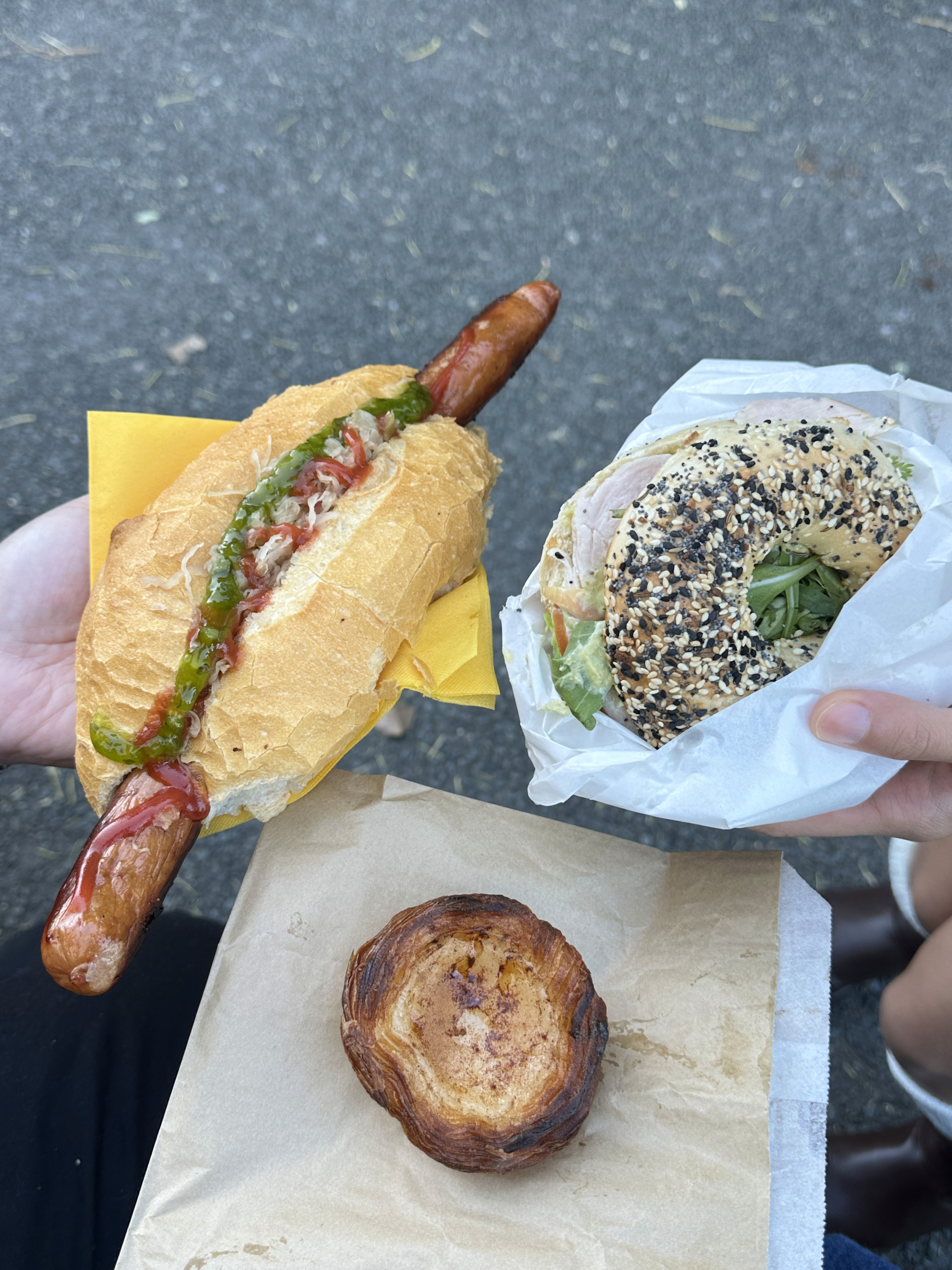 Loved the hotdog bun (baguette was crisp, sausage was rlly juicy, relish n sauce was a good addition too). Saw Lisboa's Caffe (a place I saved) had a popup here, so I decided to try the Pasteis de Nata (egg tart), kinda pricey (AUD 5 i think), was decent but wouldn't buy again. Luckily I didn't specially go to the shop just for it. Smoked chicken bagel was pretty lame n bland.