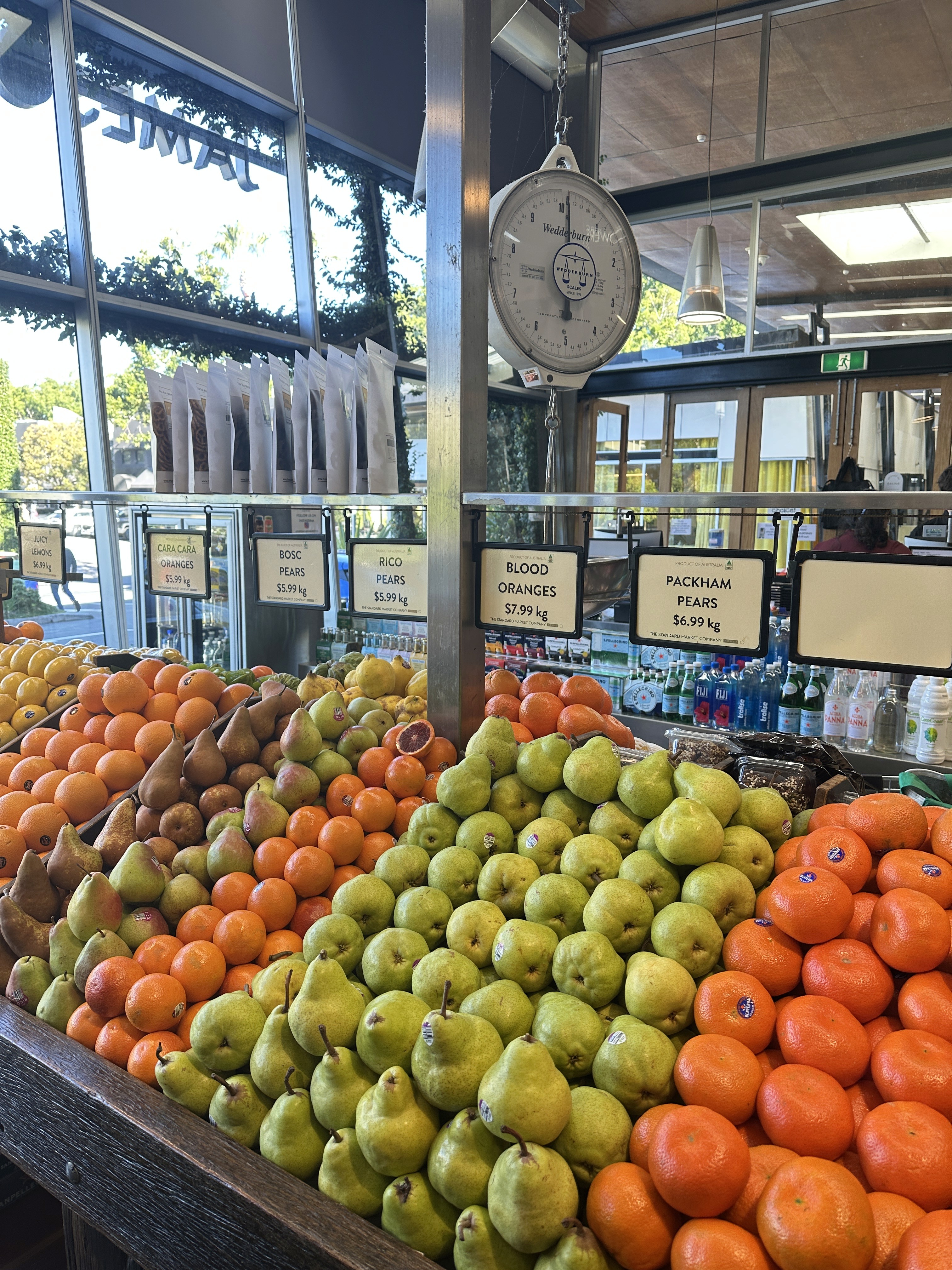It was winter, so we mainly had avocadoes, kiwis, berries, many varieties of oranges (Cara Cara, Murcot). Also bought things like hummus, Yo-Chi in pints, smoked salmon, sourdough from bakeries, cream cheese.