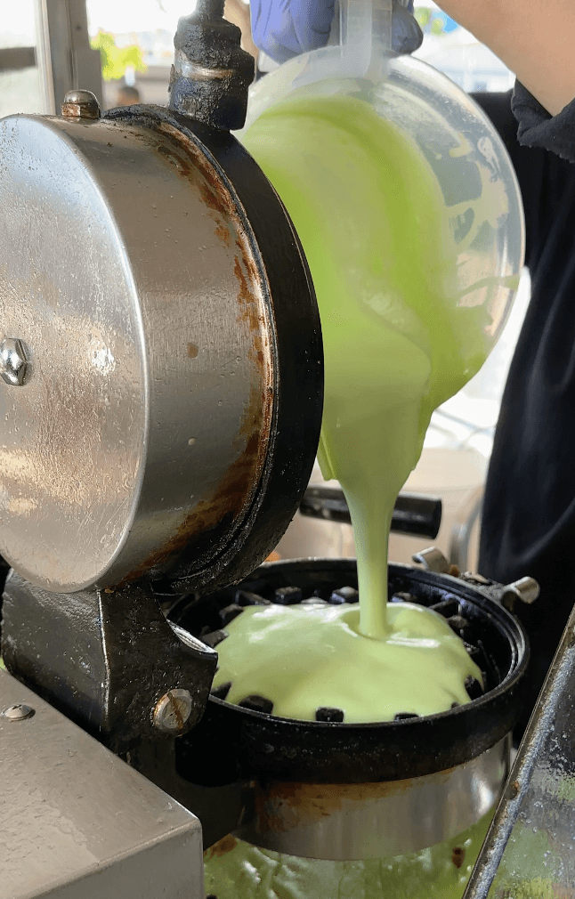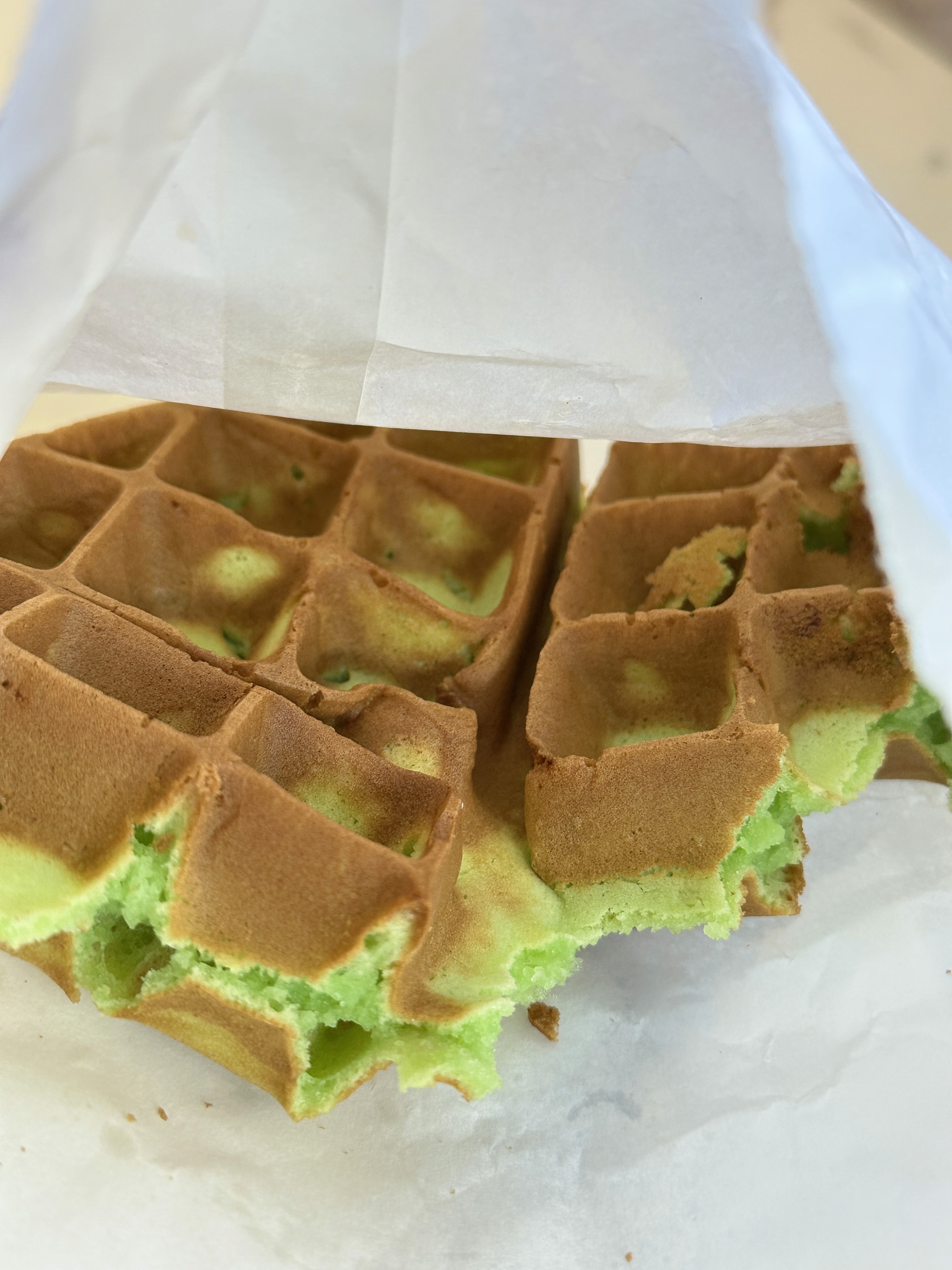 Along the outside pathway leading up to the entrance of Inala Plaza, there's some public spaces and seats (spotted uncles playing chess ofc) and some stalls as well. We got a sugarcane juice and pandan waffle from a street stall. The sugarcane was super gao (very dark green, like almost can't see through it) and pandan waffle is the best I ever had, look at the thick batter, the crisp and the chewiness from the waffle was perfect.