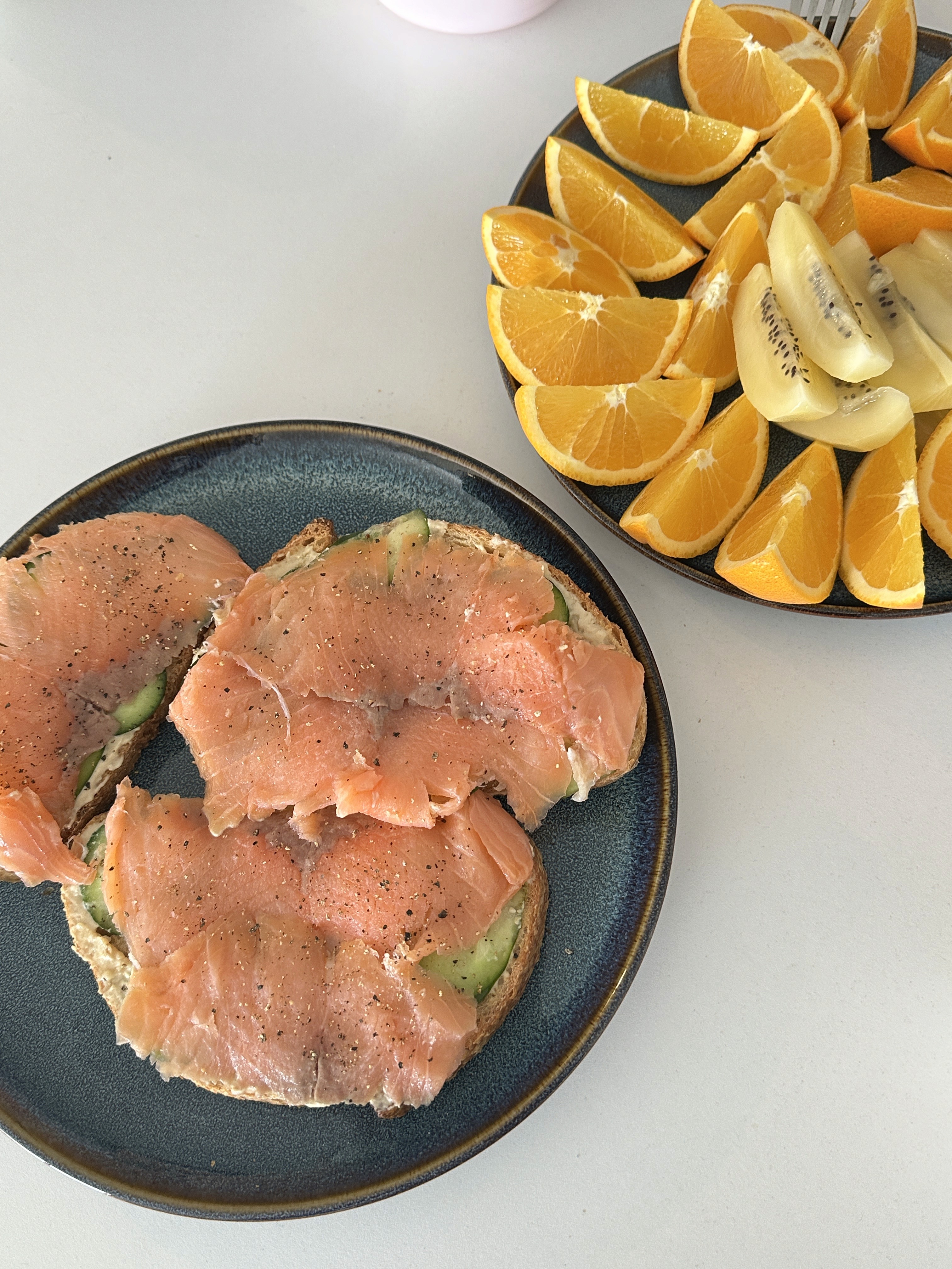 Smoked salmon toast + fruits for quick brekkie at home on some days