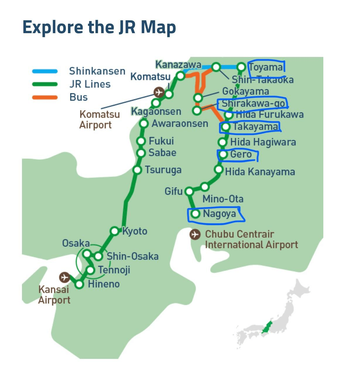 Got the 7-day JR pass for our 8-day trip. The JR pass would have covered all the places we intended to go to (circled in JR map below) — Nagoya, Gero, Takayama, Shirakawa-go, Toyama.